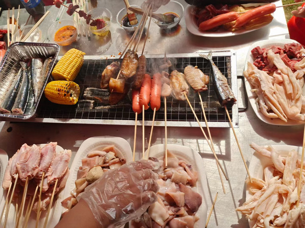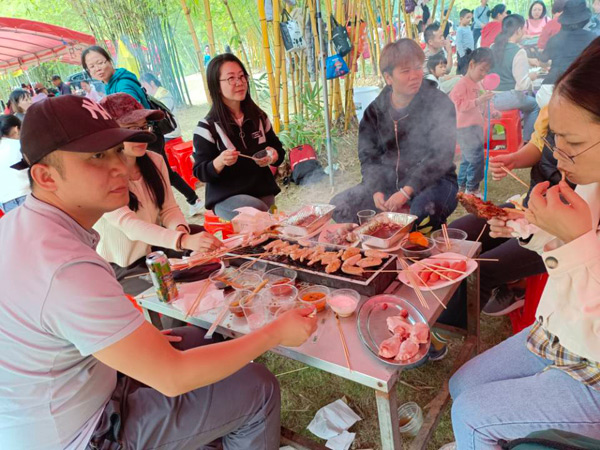 11:30體育運(yùn)動(dòng)結(jié)束后,大家來到燒烤場進(jìn)行自助燒烤。燒烤場座落在綠蔭濃濃的竹林中,雖是冬日,卻煦日暖暖,溫和的陽光打在竹葉上,落下斑駁的日影,清風(fēng)襲來,沁人心肺。燒烤場里飄香四溢的烤全羊、外酥里嫩的烤香豬、肥肥的雞腿、嫩嫩的雞翅、勁頭十足的牛肉丸,還有火腿、茄子、玉米、青椒等早已備好,此時(shí)大家早已饑腸轆轆,便迫不急待地動(dòng)起手來,“自力更生”,喂飽自己的肚子! 大家團(tuán)坐在烤爐旁,你遞個(gè)調(diào)料,我刷下辣醬,互幫互助,默契盡在不言中,其實(shí),這也是一種心靈的溝通與交流。